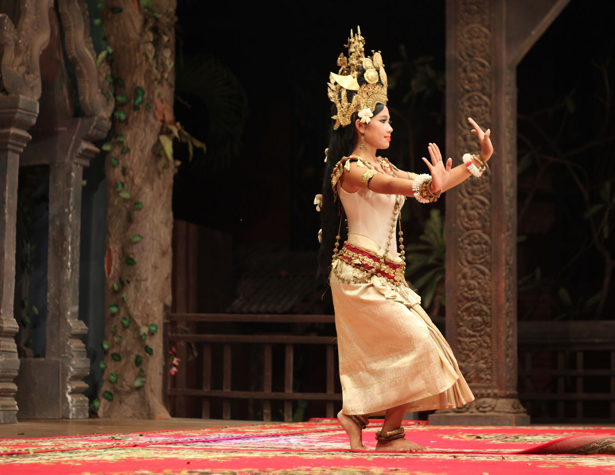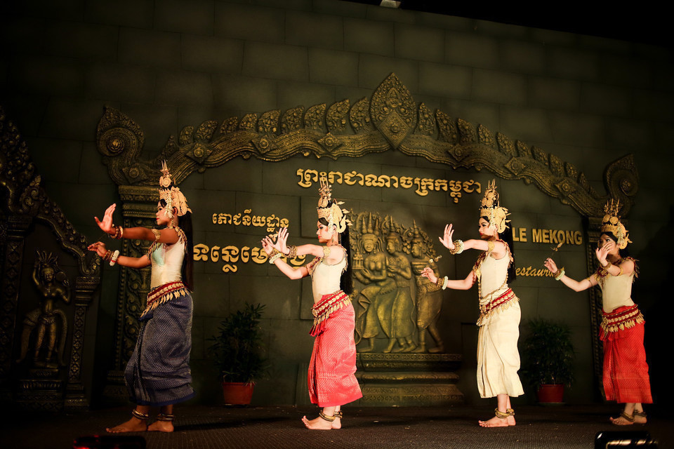5、欣赏高棉天女舞 天女舞是著名的柬埔寨宫廷舞。在9至14世纪吴哥王朝,高棉文化发展到一个鼎盛时期,宫廷和寺庙中培养了大批舞蹈家和乐师。在宗教文化活动中,音乐舞蹈是很重要的一部分,因此这些舞蹈家便被视为“人间神女”,称为天女。在暹粒的一些酒店或自助餐厅都可以看天女舞,价格从12美元到30-40美元不等。