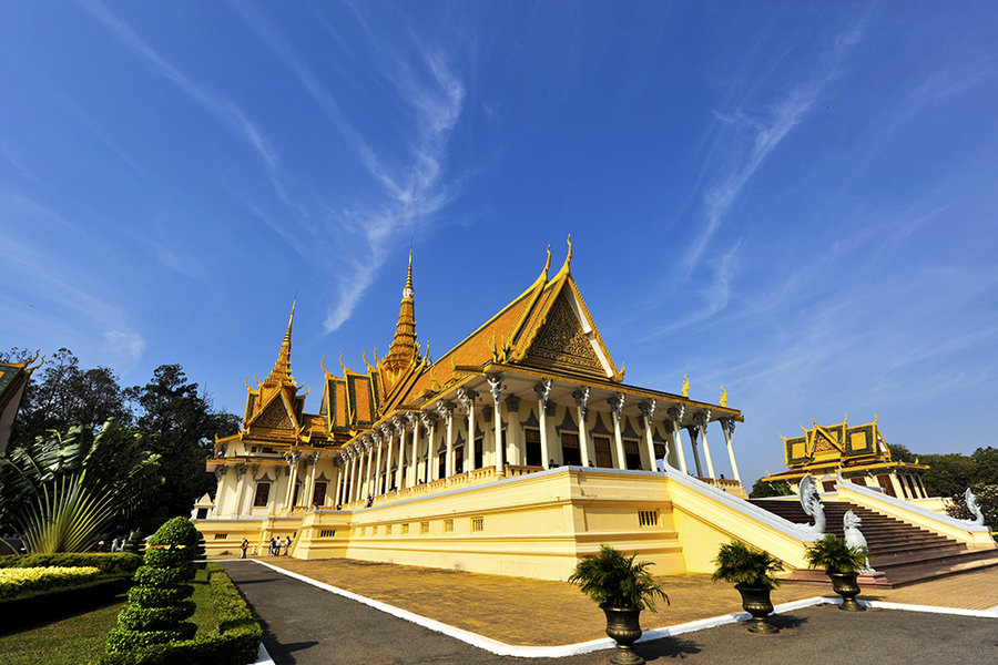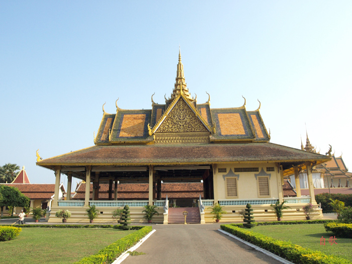 10、金边皇宫 金边皇宫建于1866-1870年,又称四壁湾大皇宫。位于金边东面、面对湄公河、洞里萨河、巴沙河交汇而形成的四壁湾。整个皇宫是典型的高棉式建筑,多为代表着佛教的黄色和代表着婆罗门教的白色,看上去金灿灿的,是探索高棉建筑和宗教文化的必去之地。皇宫目前仍为国王所居住,因此只有部分向游客开放,皇宫的墙上至今仍挂着国王西哈努克的画像。