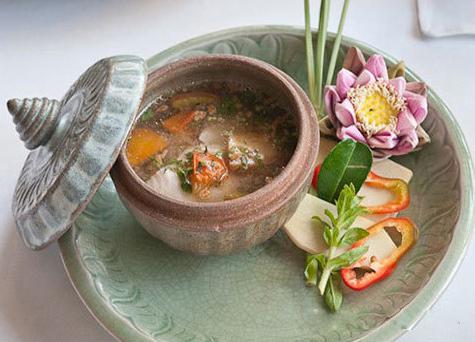 这很像越南的春卷,新鲜的蔬菜卷在薄薄的煎饼里蘸着调料吃。 酸味汤(Khmer Sour Soup)