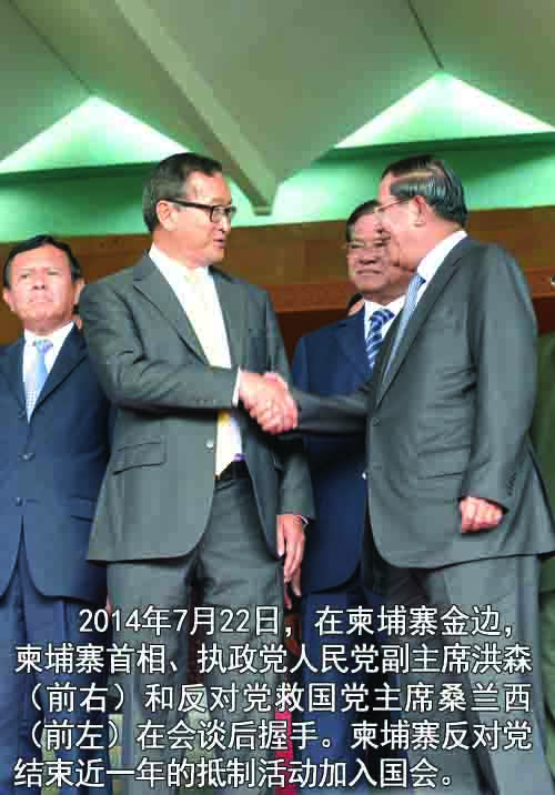 8月8日,55名救国党议员与68名人民党议员一起坐进国会会议厅。柬埔寨第五届国民议会终于告别跛脚局面,完整地行使权力和职责。一场政治博弈经过整整一年的时间,宣告结束。