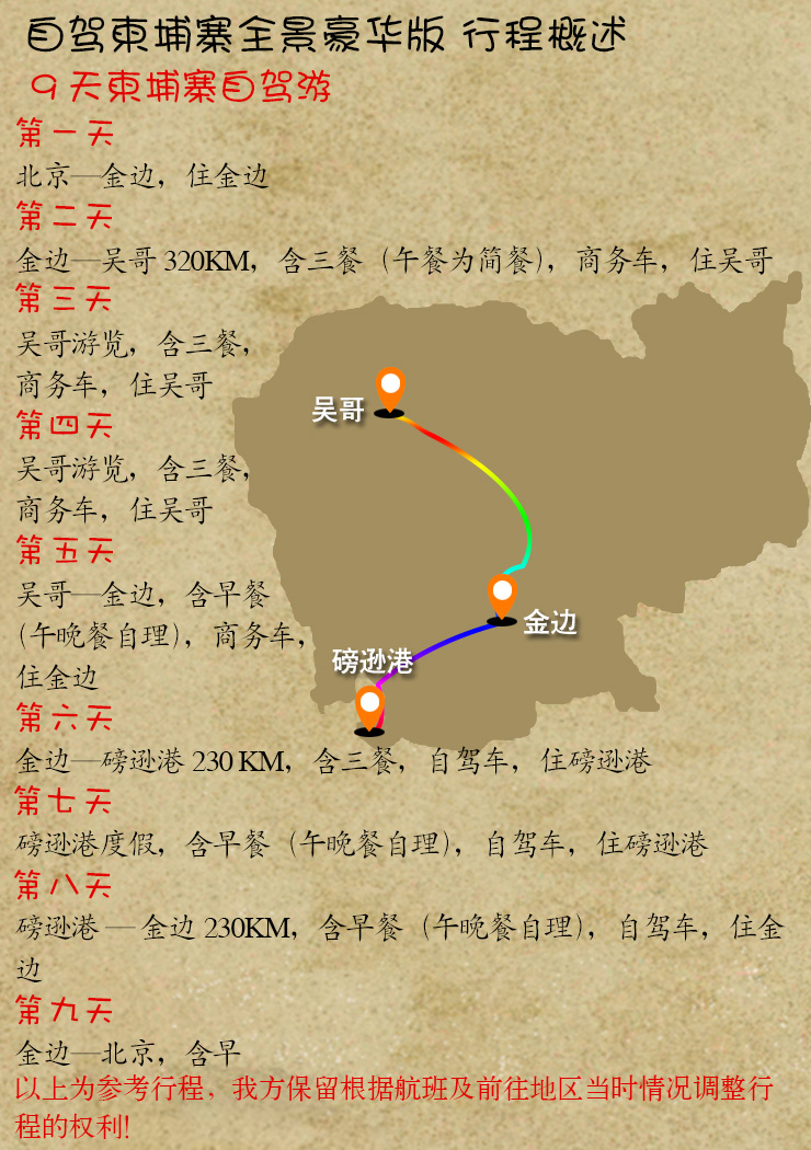早餐后继续自由活动(午餐自理)。12:00退房集合返回金边。抵达金边入住酒店后自由活动,可浏览中央市场和当地的超市,自由购物。