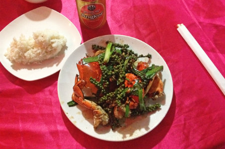 贡布胡椒蟹 贡布省南部的海岸线上以两种东西出名:一个是海鲜,另一个是胡椒农场。新鲜的煸炒蟹肉和点缀其中的绿色的花椒共同组成了这道简单的菜。呛口的花椒和香甜的蟹肉会让您唇齿留香,别忘了来点花椒来感受味觉的刺激。