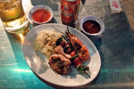 烤肉串和烤鱼 在柬埔寨,无论你走到哪里,你都会看到烧烤店内兹兹的烤牛肉或是烤鱼。虽然也有鲷鱼和明虾,但是最好的鱼类是从当地的淡水湖产出的,海鲜通常佐以青芒而食,而肉类则通常搭配着咸菜。