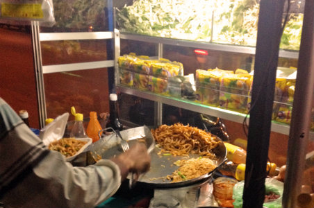 Lort Cha 这道菜通常是由路边的小吃摊为摩托或是三轮摩托车司机提供的夜宵。切短的辣炒面和长度相当的豆芽相配,再和熟蔬菜、洋葱以及煎鸡蛋一起炒熟,最后在上盘之前和酱油以及辣椒搅拌均匀,十分美味。