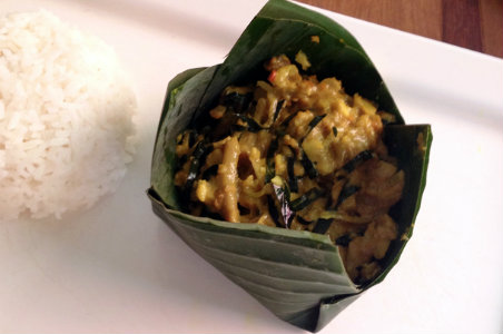 高棉红咖喱 尽管这道菜很像泰国的红咖喱,但其里面还加了很多八角、豆蔻、胡椒、香菜。和椰奶一起煮的咖喱比西部边境产区的咖喱色泽更红,人们通常用这种汁来煮鸡肉或是像茄子、土豆、四季豆之类的蔬菜。