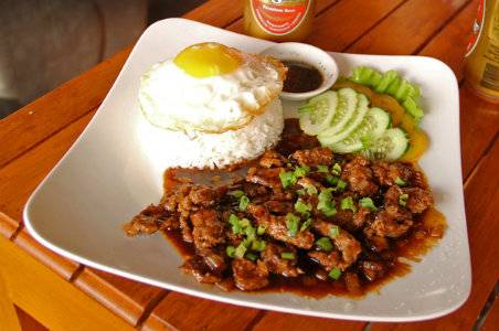 Loc Lac牛肉饭 这道菜是由耗油、酱油和牛肉煸炒而成,有时还会加一些棕榈糖。传统上会搭配米饭来吸收蜜糖汁,但现在也会经常搭配薯条或者是在顶部放一个煎蛋。