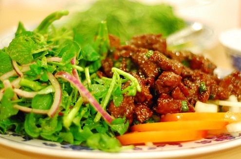 酸橙高棉牛肉沙拉里的牛肉会被切成薄片,因此它很容易吸收酸橙汁。它更像一道牛排而不是沙拉。