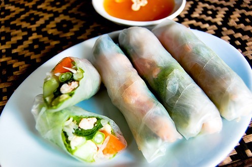 类似我们的卷煎饼,新鲜的蔬菜卷在薄薄的煎饼里蘸着调料吃。