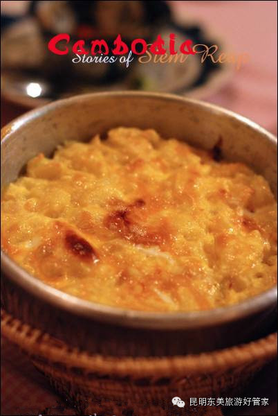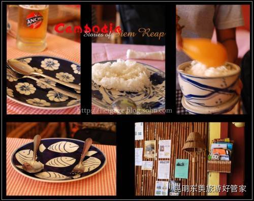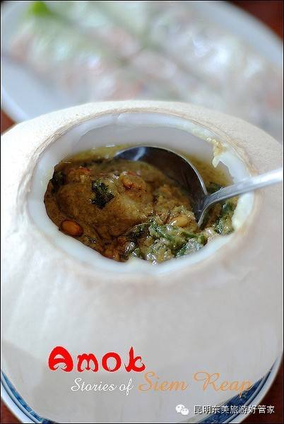 amok 首先,一定要尝尝这个amok,几乎是每家餐馆的当家菜。amok里面可以选配鸡和鱼,当然一定要鱼,因为那边的动物都瘦到皮包骨头,鱼肉相对来说好吃很多。