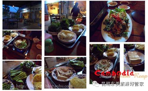 火锅——he soup dragon 去柬国一定要吃当地的火锅,攻略上包括lp都推荐的龙之汤(the soup dragon)。 吃的过程是这样的:一个炉子,炉子上放了一个小砂锅,打开盖,里面咕嘟着热汤,再过一会,有人端着一个装了12盘菜的铁盘子,蘸料有两种,一种黑点,一种白点。味道绝对的好吃,那个沙拉也好吃极了。