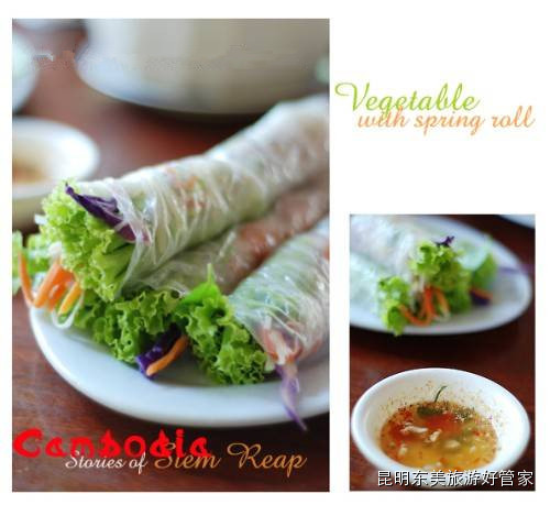 Vegetabe with spring roll 超喜欢的口感,小碗里的蘸料很好吃,分析了半天,觉得应该有花生、柠檬汁,还有什么,我觉得应该混合了什么香料的汁液。柬国很爱吃那种小豇豆,比国内的小,口感要韧一点,春卷中除了有生菜、黄瓜、豇豆外,还有一些说不清楚的颗粒物,很香,当然也混杂了一些香草,罗勒是少不了的哈。