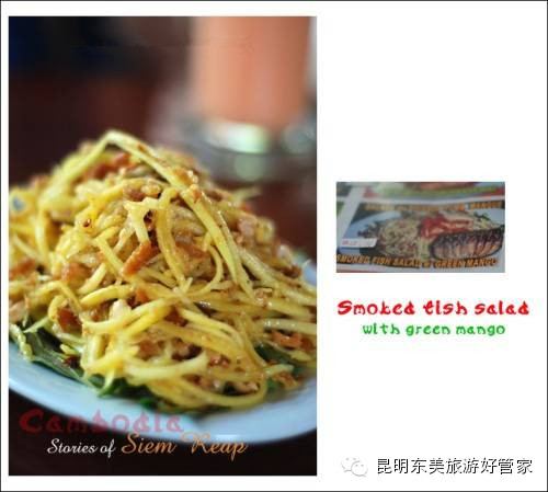 smoked fish salad with green mango 这个菜里的鱼在柬国叫臭鱼,叫着臭,吃着香。口感很脆,香香的,类似把豆豉鲮鱼炸过后的感觉。柬国菜重用香料,各种香草叶子搭配的很好,翻开青芒果和鱼,最下层是罗勒、百里香等的叶片,混在里面一起吃,味道带着水果的甜、鱼的香、香叶的各种清香,配点花生碎,香味属于层次很丰富的一道菜。