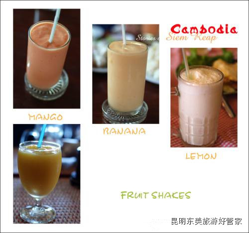 fruit shake 在柬国吃饭,饮料除了啤酒外,就是各色的fruit shake,这可绝不是fruit juice。区别在于,juice就是榨出来的果汁,而shake则需要多的工序来加工。除了水果外,还要把冰块做成沙冰,然后加入炼乳等东西。所以shake很甜,口感很好。