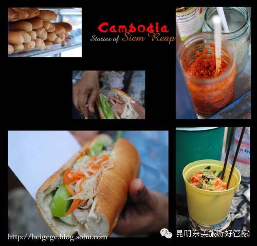 早餐面包 柬国的常规早餐,面包有点像法棍,里面的料很多,口感很劲道,一剖两半后,抹上奶酪,加点青的西红柿、黄瓜、午餐肉、抹点老板自制的辣椒酱(超辣),夹上青木瓜丝和胡萝卜丝做的凉菜,味道还不错。