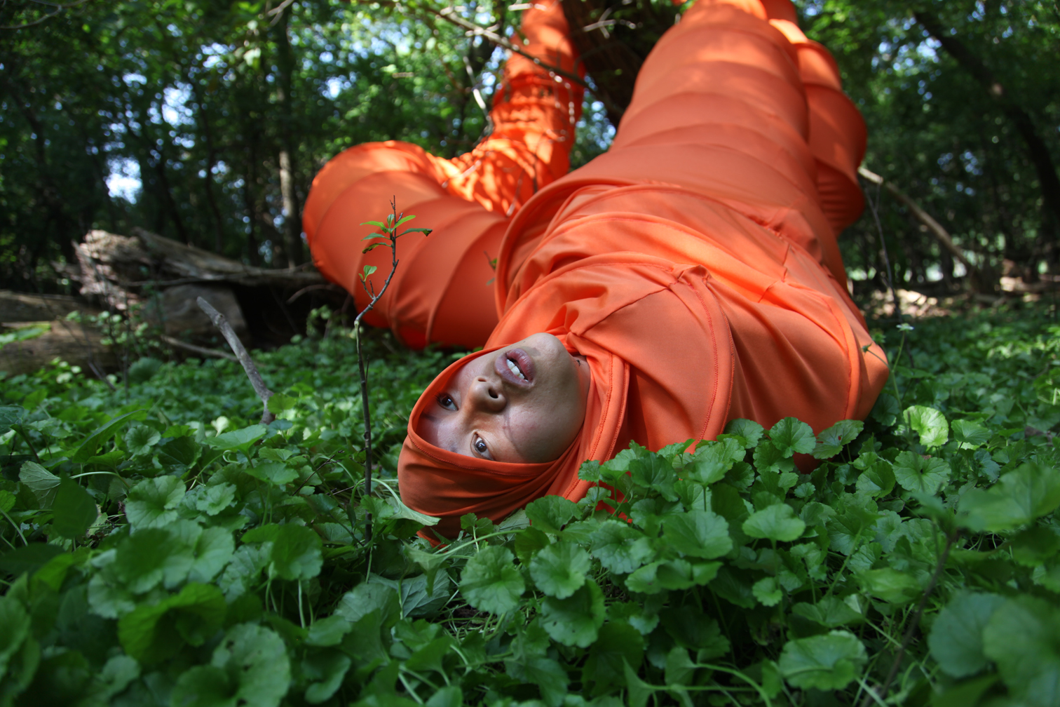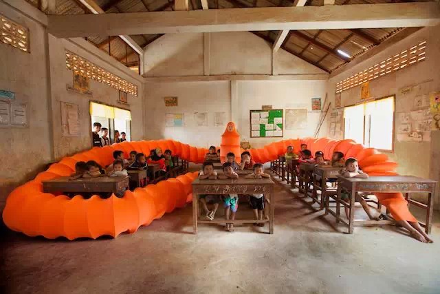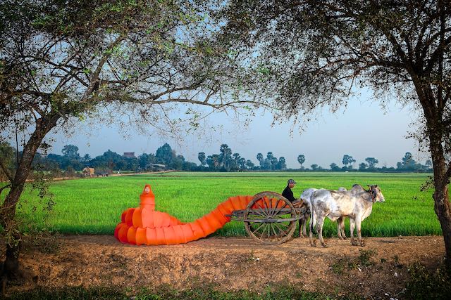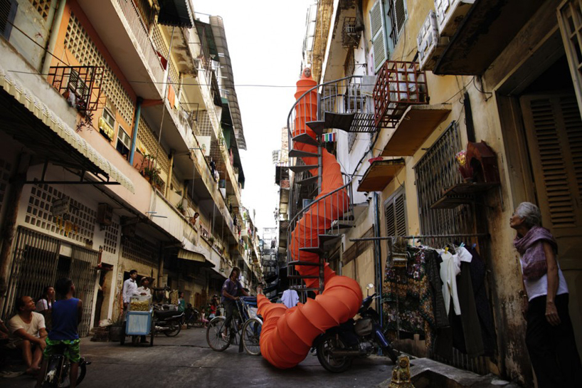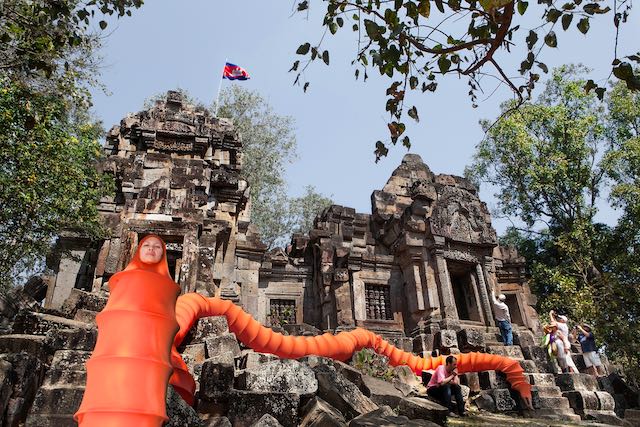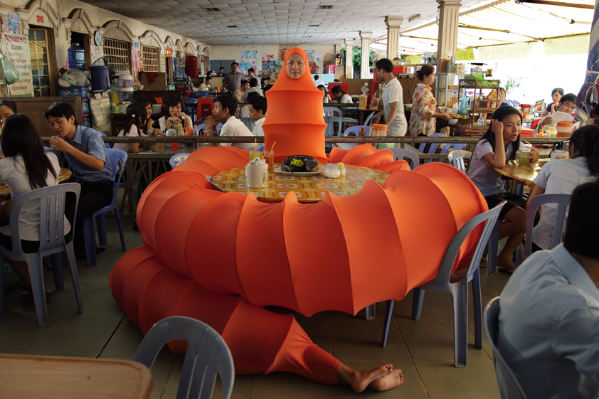 这条橙黄色的“佛陀虫躯体”是艺术家对自己身份的一种自传式的探索,她提出了一个穆斯林高棉人却始终保持着一种几近痴迷的佛教信仰的美丽。30米的虫身、亮橘色的表皮,除了巨大的体型让人难以忽视之外,人面以及尾部一对裸露在外人类的双脚,都能让人不由自主的产生自我投射。当然,艺术和艺术品之所以吸引人,正是因为其“一千个哈姆雷特”的原因,而我选择如此去理解的原因是,艺术家本身的经历。