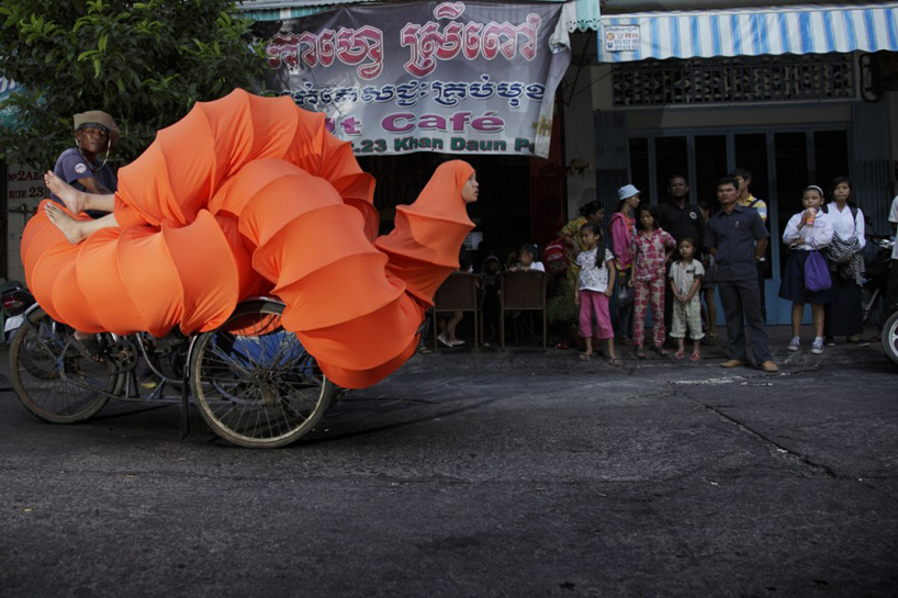 年幼时跟随父母逃难前往美国,并在那里被父母以传统的伊斯兰教方式养大成人,并在25岁时再次回到出生地,才真正认识了柬埔寨,并深深为这片土地上丰富的人文色彩和环境感动。“佛陀虫”的颜色——亮橘色代表者柬埔寨深厚的佛教文化,众所周知,这也是僧侣袈裟的色调,而圆弧紧贴只露出面部的“头饰”,正式穆斯林妇女的头巾造型,或许这也是柬埔寨境内少数穆斯林族裔的代表。