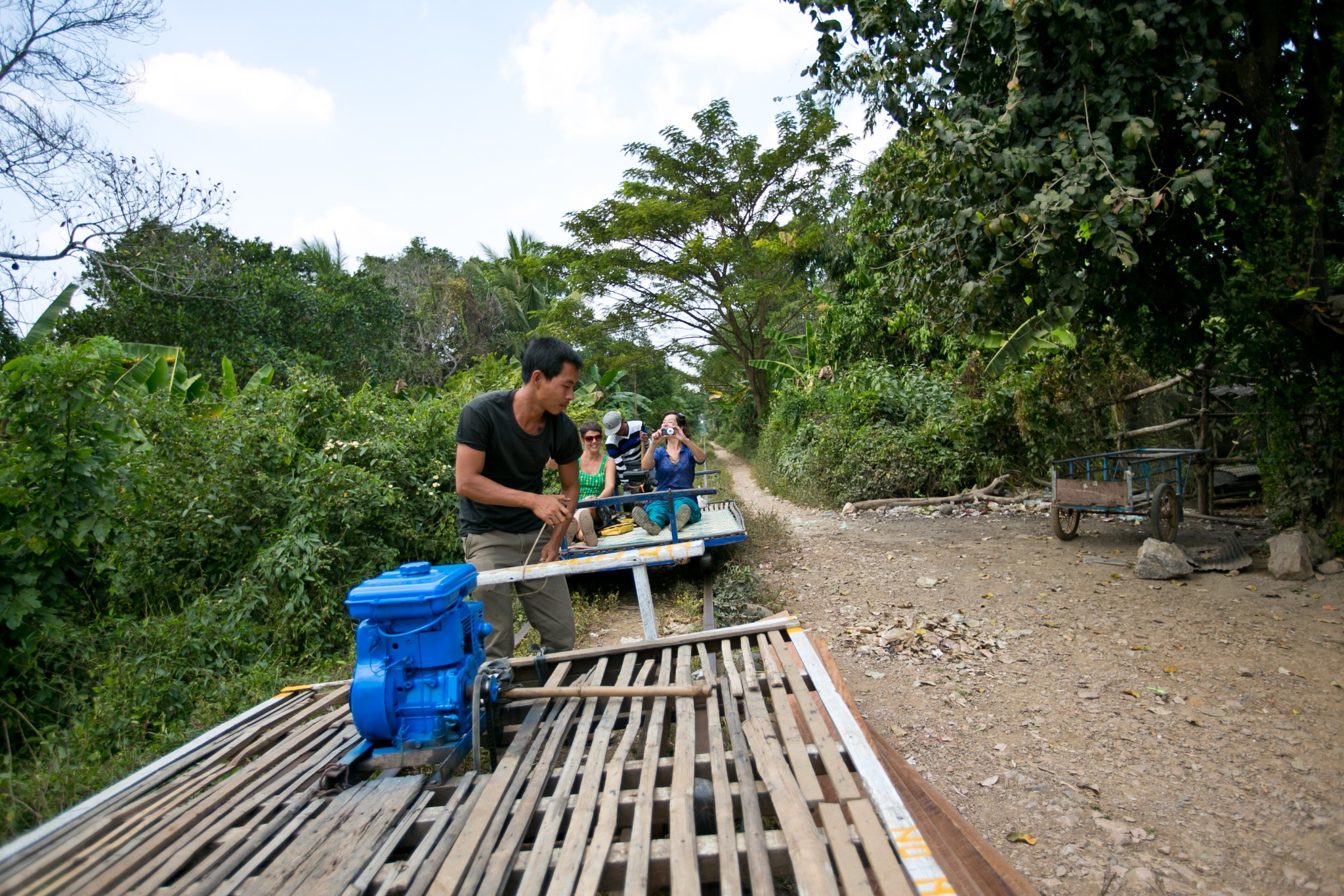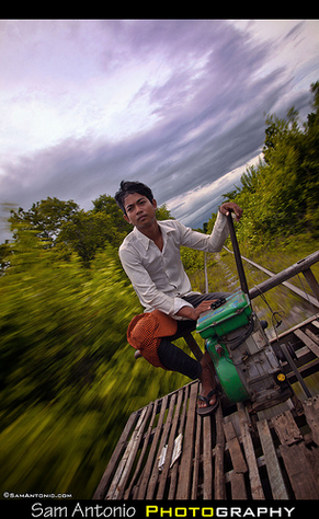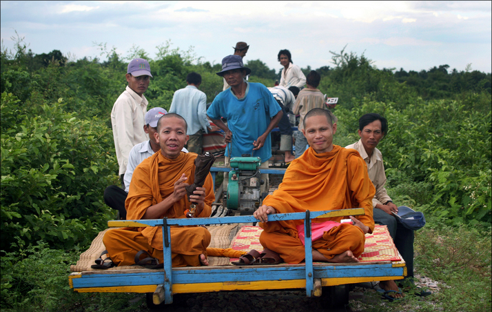 来到马德望,你不能不尝试一下搭乘这里最有特色的交通工具:竹车。没有栏杆,只有几块竹子拼成的板,一个发动机,一条毯子和一个司机,走在铁轨上。