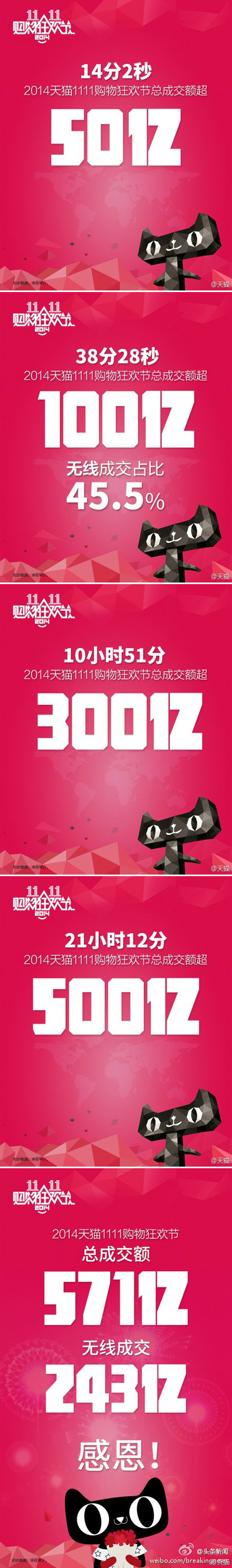 截至今年11月11日24时,天猫双十一总交易额达到571亿元,其中移动端消费占比42.6%,参与交易的国家和地区超过240个。这是阿里巴巴在美上市后交出的第一份答卷,再次刷新了单一电商平台单天交易的世界纪录。大家都贡献了多少? 双十一”消费排行榜出炉,荣获“败家”前五名的省份(市)分别是:广东、浙江、江苏、上海、四川。这么拼,各位”败家党“,你的家乡上榜了吗