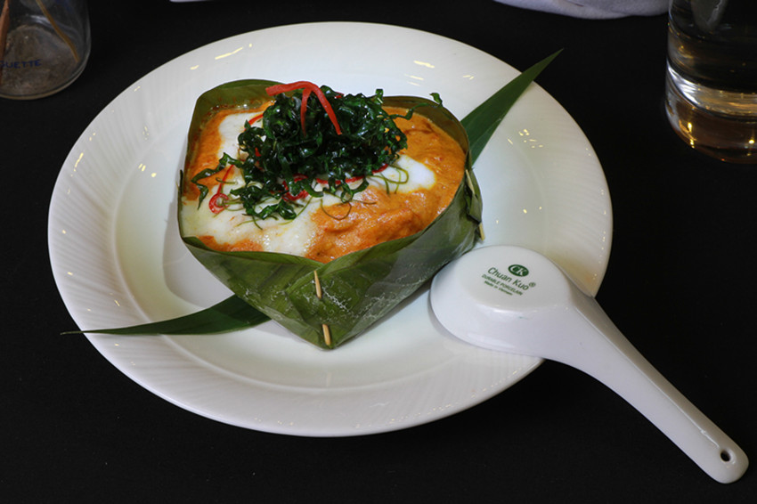 今日菜谱:Fish Amok阿莫克鱼 准备材料: Banana Basket 香蕉叶篮子 1 个 Coconut cream 椰浆 100 毫升 Chili paste 辣椒酱 1 茶匙 Sunflower oil 向日葵油 1 茶匙 Amok paste 阿莫克酱 2茶匙 Palm sugar 棕榈糖 10克 Fish sauce 鱼露 10毫升 Salt 盐 少许 Cat Fish filet-sliced-portion鲶鱼片 150克 Vegetable stock 蔬菜高汤 10毫升 Gnor Leave-shredded 阿莫克叶 1片 Peanut crushed 花生仁碎粒 1茶匙 装饰: Thick coconut cream 椰浆 Chili julienne 辣椒切丝 Lime leave julienne 柠檬叶切丝 Fried julienne gnor leaves 油炸阿莫克叶切丝 烹饪方法 1. 把平底锅用中火加热1分钟,然后加入向日葵油,再用大火 把油烧热; 2. 把阿莫克酱、辣椒酱、鱼露、棕榈糖和蔬菜高汤放入锅 中,用中火微拌2分钟至均匀; 3. 飘香之后加入鱼片,再轻微搅拌1分钟; 4. 把椰浆、花生仁碎粒和阿莫克叶放入锅中再用中火微炒三 十秒; 5. 把锅中的材料取出,然后放入香蕉叶篮子里,之后放入蒸 笼蒸煮4分钟; 6. 把煮好的阿莫克取出,淋上椰浆,再撒些辣椒丝、柠檬叶 丝和阿莫克叶丝来作装饰。 葛儒达烹饪课,手把手教你做高棉菜! 觉得食谱太复杂?那就来参加葛儒达烹饪课吧!我们的大厨会手把手教你哦!每两个月我们都会开一次烹饪课,根据提供的食谱教大家学做高棉美食。每个人交食物材料费即可参加,食材由葛儒达餐厅提供。欲知烹饪课时间及其他详情,请关注我们的微信账号:garudacambodia