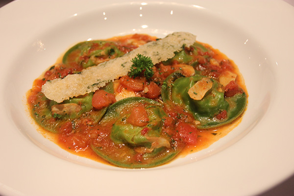 另外,餐厅主厨亲自研制的一道特色菜品——“意大利蟹肉馄饨”也颇为惊艳。青绿色的面皮儿内裹鲜蟹肉,混含意大利乳清干酪,再以纯正橄榄油加入蒜片烹制,浇注番茄制成的酱汁,仅想象这几个味道的组合,鲜香就似扑鼻而来。
