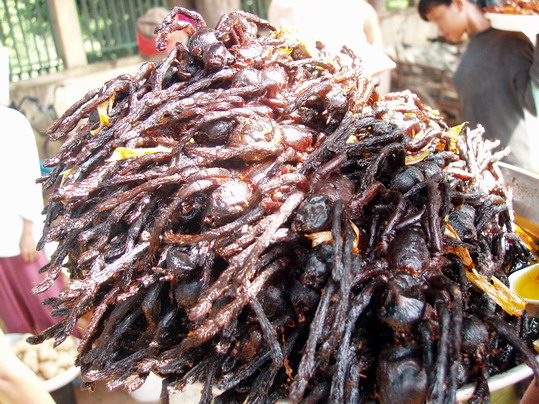 柬埔寨人吃蜘蛛?!大多数读者或许都有所耳闻吧。这些蜘蛛让不少外地人感到很害怕甚至恶心,但对这里的不少人来说,它们可是美味佳肴。来到吃蜘蛛的中心发源地——首都附近的贸易城镇素昆镇,您会看到当地的妇女们头顶着装满油炸蜘蛛的篮子热情地邀您品尝,小孩子们直接用手握着这些被他们当作美味零食的蜘蛛,来自金边或其它各地的蜘蛛采购者络绎不绝...... 这种腿上长着长毛的毒黑蜘蛛,不像我们常见的蜘蛛凌空结网而居,而是生长在地下,挖穴栖身,以吃草根果腹,抓它们要掘地三尺,所以在这附近的村庄随处可见地上被人用铁铲挖掘过的坑洞。因为当地人已经视找蜘蛛为主业,卖蜘蛛已经成为他们的主要收入来源。 柬埔寨人发明的该蜘蛛最地道的烹饪方式便是“一定要随捉随吃”,然后用木柴生火,用平底锅细炸,配上大蒜和盐等调料,方能保持其新鲜风味。如此加工后的油炸蜘蛛色泽黑红,外面包着一层酥脆的硬壳,里面则是细嫩多汁的鲜肉,据说口感非常棒。 相关资料显示,柬埔寨人利用毒蜘蛛的历史悠久,相传已有几百年,但历史上仅仅是为泡酒所用。据说蜘蛛泡酒在柬埔寨传统医学中可以滋阴壮阳,治疗腰痛和儿童呼吸系统的疾病,以及防治风湿等,因此广受平民百姓的推崇。至于吃蜘蛛肉的这项习俗是如何开始的,目前仍不是很清楚。大多数人认为是起源于红色高棉时期,在波尔布特的暴政与旱灾导致的食物短缺逼迫下,人民出于无奈才开始食用蜘蛛、老鼠、蜥蜴之类的生物。没想到如今这种让人有些悚然的食材,还成为了当地的一个重要产业链了。 然而,物极必反是一个具有普遍性的生态学原理。据柬埔寨当地媒体报道:“在乡民的大量捕食下,蜘蛛数量已逐年减少。仅素昆一个小镇,每周就可卖出20万只蜘蛛。如今当地人必须到更偏远的森林里寻找蜘蛛的踪迹,因此价格也不断飙涨。”野生蜘蛛被大量捕食,必将导致生态系统失衡。因此,对于吃蜘蛛这种暂时的口感和挑战的满足感,人们应该宏观地审视 并反思一下了。 【关于柬单网】 “柬单网khmernavi.com”是一个引导在柬华人生活、提供真实商家信息、华人互动参与的中文信息网站,旨在简单您的生活!更多信息请关注中文杂志【品味高棉】 微信号:khmernavi 点击阅读原文,进入柬单网讨论。