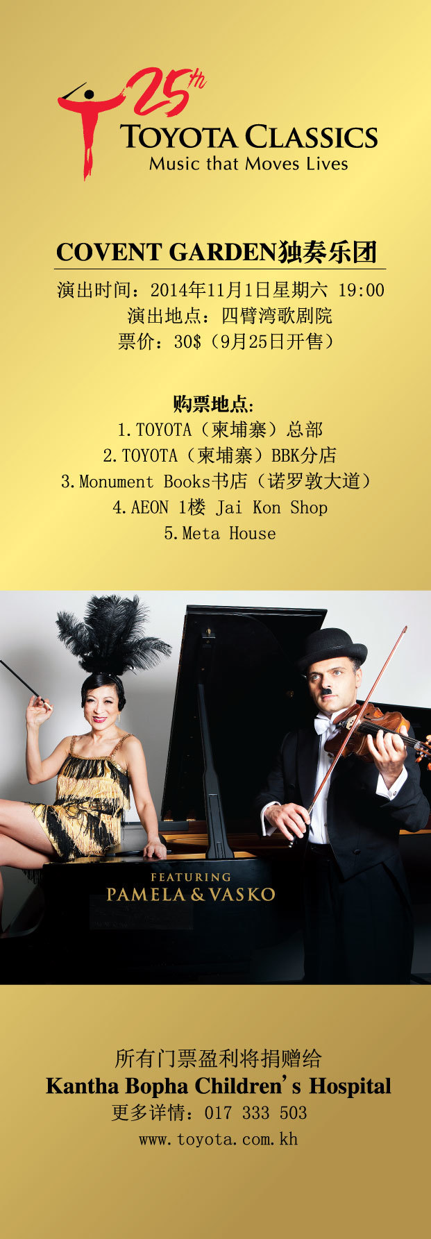 COVENT GARDEN 独奏乐团 演出时间:2014年11月1日星期六 19:00 www.toyota.com.kh 【关于柬单网】 “柬单网khmernavi.com”是一个引导在柬华人生活、提供真实商家信息、华人互动参与的中文信息网站,旨在简单您的生活!更多信息请关注中文杂志【品味高棉】 微信号:khmernavi 点击阅读原文,进入柬单网讨论。