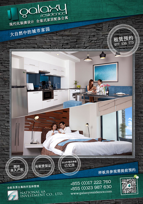 Galaxy Residence完全竣工之前80%的套房已经被投资者们提前抢购了,这次开盘发布后,Galaxy Residence的居住套房和商业单元也将会所剩无几,望您欲购从速! 联系电话:+855(0)17 222 760 +855(0)23 987 630 【关于柬单网】 “柬单网khmernavi.com”是一个引导在柬华人生活、提供真实商家信息、华人互动参与的中文信息网站,旨在简单您的生活!更多信息请关注中文杂志【品味高棉】 微信号:khmernavi 点击阅读原文,进入柬单网讨论。