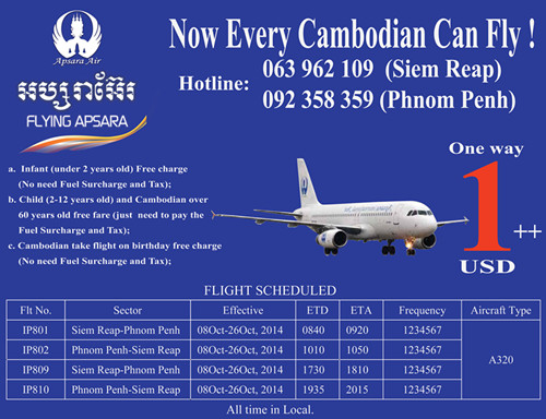 仙女航空8号正式开航,单程仅1$起!!! 详情如下: 1.婴儿(2岁以下)免费(无需燃油附加费和税费); 2.儿童(2-11岁)及60岁以上柬埔寨老人免费(仅需燃油附加费和税费); 3.柬埔寨人生日当天免费乘坐(无需燃油附加费和税费)。