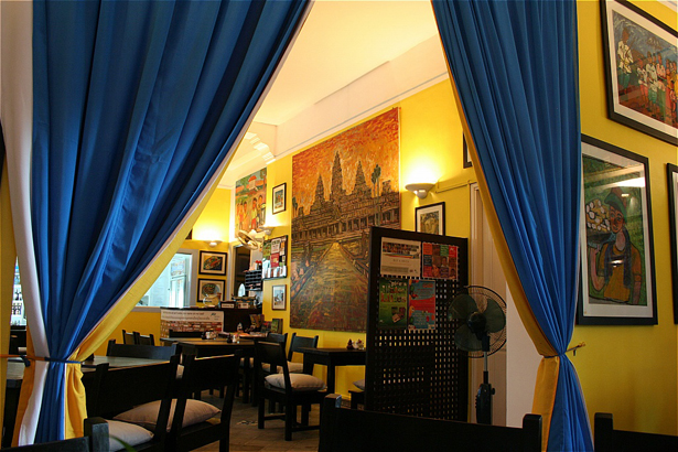 在BKK1,传统柬埔寨建筑改装的本土餐厅,与旅馆结合,价格中等,是家人或朋友相聚的好去处! 地址:No74 St57 电话:012 887 320 5.Frends Restaurant 由NGO经营的公益餐厅,为柬埔寨流落街头的青少年和成人提供培训机会,使他们习得一技之长,能拥有更美好的前途。