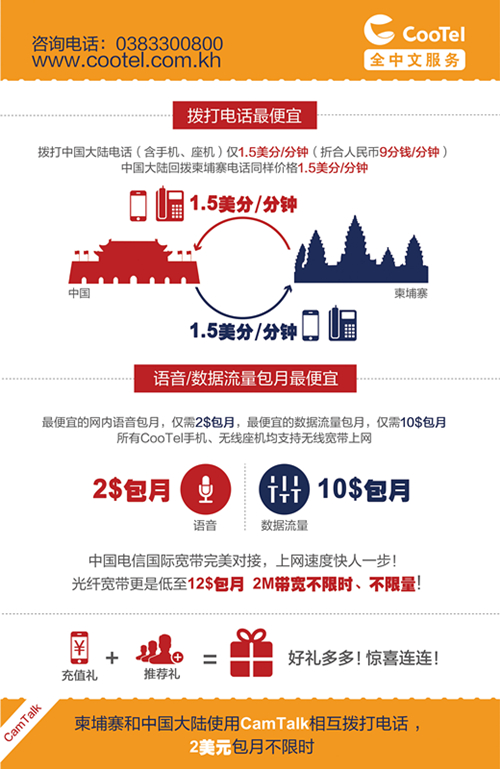 CooTel电信全中文服务!拨打中国大陆电话(含手机、座机)仅1.5美分/分钟(折合人民币9分钱/分钟)。 最便宜的网内语音包月,仅需2$! 最便宜的数据流量包月,仅需10$! 所有CooTel手机、无线座机均支持无线宽带上网哦! 中国电信国际宽带完美对接,上网速度快人一步!光纤宽带更是低至12$/月,2M宽带不限时、不限量! 柬埔寨和中国大陆使用CamTalk相互拨打电话,2$包月不限时,特别适合与国内家人或朋友频繁联系的朋友哦! 咨询电话:038 3300 800 CooTel官网:www.cootel.com.kh
