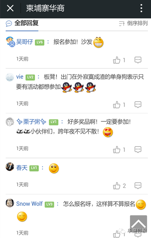 由《华商日报》微信公众平台社区主办的“跨年倒计时 金边狂欢夜”活动,在华商社区发布后,已经吸引了大批微友跟帖报名,参与抽取大奖活动。