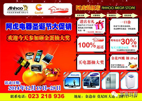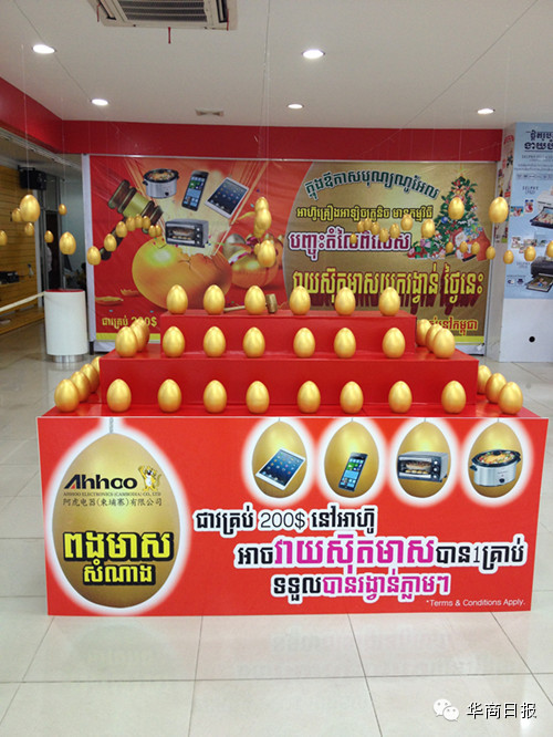 符龙/金边报道 阿虎电器做为进驻柬埔寨有实力的电器企业集团,值此圣诞、新春将至之时,以别开生面的“砸金蛋”方式,回馈所有客户。 阿虎电器销售经理黄裕表示,阿虎电器在柬埔寨数年来,一直积极开发与客户的互动、优惠活动。此次“砸金蛋”活动的推出,将更激动人心。顾客只要在阿虎电器消费满200美金,即可砸一枚金蛋,而且金蛋的中奖率100%,奖品更是丰富,包括iPad Mini,手机,电烤箱,慢炖锅等实用品,奖品总金额超一万美元。