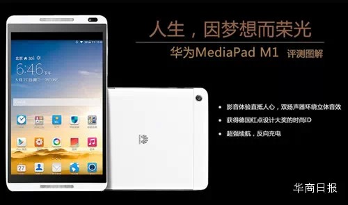华为M1,即华为MeidaPad M1, 一款为3G,4G时代量身定做的平板电脑,在2014年MWC大会上首次露面。华为M1是一款8英寸平板电脑,配置IPS高清大屏,搭配华为独家SWS技术的前置双扬声器,可以带来极致的影音体验。