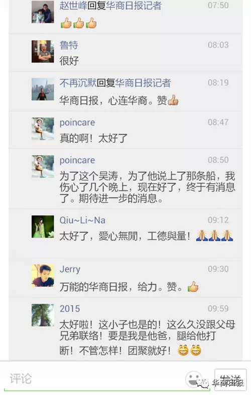 众人心系 共盼团圆 前(12)天的新闻发出后,记者不断收到得知吴涛相关信息的朋友提供的线索,在代吴家人表达感谢时,各个提供信息的微友均表示,出门在外,都希望大家能够和家人团团圆圆。“寒冰”对记者说:“不用谢我,同是天涯沦落人,应该的,希望能帮到那位老父亲”,微友“poincare”在我们发的帖子内颇有感触,记者一度以为他和吴涛相识,后经了解,两人素昧平生。“不认识,就是和他年龄一般大,所以做了很多联想,说真的,那天夜里我还流泪了,想想他父母的心情,不能不流泪”。微友“俊”在转发我们的消息时留言道:“我转发了,可怜天下父母心”。众多微友也纷纷留言:“请持续关注”、“希望一家团圆”、“希望这位老乡平安”等等。