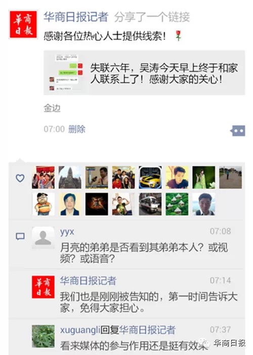 姐姐吴春梅对记者说:“他说这些年觉得没有脸和家里联系,我把他QQ号也告诉你,你问一下心里是怎么想的吧。他说他看到了你们的新闻,他老婆看了一直哭,说会不会不要她了”,“他没给我他的电话号码,不过他说今天下午5:40下班了会给爸爸打个电话亲口报平安”。 记者将消息发布至朋友圈以后,一家人的团圆也得到了微友们的祝福。“衷心祝福你们的团圆,可是小涛也应该受批评,害得家人担心了这么多年”,“异国他乡6年,过得好与坏,都没有什么,最起码给父母报个平安,钱用了,就用了,想法回报就行”,微友“yyx”表示:“联系上就好,那我及关心他家人的朋友就放心了”。