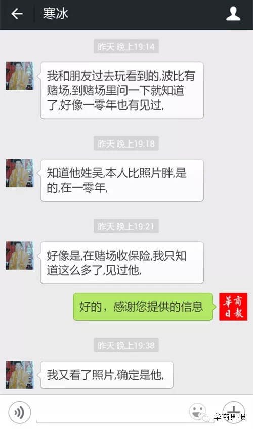 吴涛姐姐吴春梅今(14)早向记者证实吴涛已和家人取得联系 刘晟曦、吴哥仔/金边报道 柬埔寨卜迭棉芷省波比市,柬泰边境度假及博彩业重镇,赌场鳞次栉比,酒店欣欣向荣。东南亚的夕阳西下时,波比假日赌场的吴涛拿起电话,拨下了那个曾经熟悉的号码。千里之外的电话那头,是远在中国山东烟台招远市齐家镇大吴家村的老父亲。 距离两人上一次通话,已经有6年之久。2008年春天,吴涛在最后一通电话里给父亲吴庆善的最后一句话是:“爸爸,我生活很困难、吃不起饭,现在已经上了一条小船,回不来了,你自己保重”,那一个国际长途挂断后的忙音,换来的是吴庆善长达6年的焦虑不安和日思夜想。 翻开11年前离家时弟弟的旧照片,姐姐吴春梅并不敢抱太大的希望。一方面,一家人都在山东,来一趟柬埔寨不容易,另一方面,一个国家那么大,在信息缺乏的情况下找个人出来如同大海捞针。但一家人都盼了那么久,不论如何总要给自己一个交代。 而今(14)早6:00,QQ上早已不再有联系的头像再次亮了起来,这算是一个交代吗? 综合信息 定位波比 前(12)日,记者在本报微信公众平台发表《失联6年:儿啊,你还在柬埔寨吗?》一文,讲述了山东老农吴庆善一家希望求助柬埔寨本地华文媒体,寻找其失联6年的孩子的事情。报道一经发表,短短一天之内,我们就收到了不少热心微友提供的相关信息。而所有信息的集合点,直指柬泰边境的波比市。 昨(13)日下午16:03分,记者收到一位微友几条连续不断的消息:“你好,我认识吴涛”、“那个6年没和家人联系的吴涛”、“和柬埔寨女人结婚了,生了一个儿子”、“约7个月了”、“他两年前在巴域的太阳城赌场,后来搬到波比,现在在波比假日酒店赌场上班,负责赌球的工作,因为胖,所以叫他吴胖子”.... 同日晚7:17分,微友“寒冰”向记者发来信息称,自己2010年和朋友去波比赌场玩的时候好像见到过吴涛,“只知道姓吴,本人比照片胖,好像在赌场收保险”,晚上7:38分,“寒冰”再次发来消息:“我又看了一下你们微信上发的照片,确定是他”。