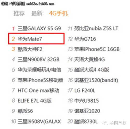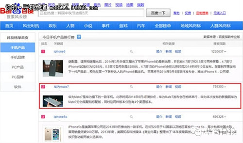 华为Mate7的火热也表现在网络上的各大排行榜。首先,来看看百度搜索风云榜。百度搜索风云榜以数亿网民的单日搜索行为作为数据基础,为最具代表性的“网络风向标”,从Mate7上市前和上市后的百度搜索风云榜中看到,同期发布的三星Note4排名从第9位下降到第16位,而华为Mate7排名一直紧跟iphone6,消费者的搜索进一步证明了Mate7的火爆。