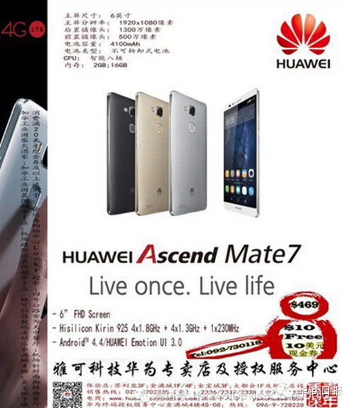 (太平洋电脑网 热门4G手机排行榜) 不得不说,除了iPhone6很少有一部手机像Mate7这样,上市时间不长就横扫各大手机排行榜。事实上,在太平洋电脑网的热门手机排行榜中,华为Mate7还未上市就已经成为唯一上榜的新品,且位居第三,而同期发布的新品三星Note4和苹果iPhone6均未上榜。随着iPhone6和Mate7的相继上市,华为Mate7与iPhone6比肩,这着实让花粉们扬眉吐气,同时“赤裸裸”验证了华为Mate7的独特魅力和超强人气。 带着这些购机参考信息,在手机淘宝上搜索Mate7,淘宝价竟被抬到4800人民币,在零售市场还开打出了5288人民币的天价。而且同样出现供不应求的现象,而实际华为Mate7中国区官方渠道价格32G版为3699元人民币,16G版仅2999元人民币(折合499美元)。之前好像只有iPhone才有非主流市场超高价格的情况,而高端手机领域同样享受这个“待遇”的则只有华为了。同时,那些想买到华为Mate7网友需要再多花点心思了,不然要么花高价格从“二道贩”手中买,要么就得再等等吧。 据了解,华为商城和华为品牌体验店等终端渠道,在加紧供货的同时,也接受消费者的预约。对Mate7感兴趣的消费者,可加紧预约购买。 在柬埔寨市场预约订购华为美腿7/ Mate7(6英寸) 469美元(已节省30美元)。再获赠原装皮套;10美元现金券。零售价格:499 美元。 特价,现金券只限于预订客户,继续接受网络特价订货1周到月底。尊享特价,特权!
