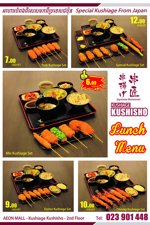 柬埔寨目前仅此一家的日式炸串专门店!午餐套餐仅6美金起,8月11-29日消费还可返五折现金优惠券,使用日期可至9月30日。