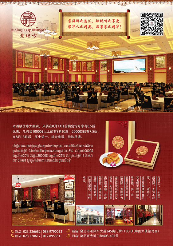 老地方海鲜大酒楼月饼隆重上市啦! 月饼好吃,取决于上乘用料与考究的烘培工艺。吃的健康关键就在于别出心裁的制的制作手法与配制。并在主要原料的选购上严格把关,所需配料更是千挑万选,保证了食用的醇正口感。传统的制作手法与配方,御聘多年经验的月饼大师现场指导,在糖分及脂肪控制上做足了功夫。 我们努力崇尚一种健康的饮食文化,以优良的卫生环境和严格的质量保证体系打造出高品质、绿色健康品牌,打造自选和馈赠亲友皆有档次品位的健康型月饼。 月圆天下品尝美味,老地方月饼你中秋的最好选择 预订咨询电话:新店 +855 23 226682 老店 +855 23 220617 【关于柬单网】 “柬单网khmernavi.com”是一个引导在柬华人生活、提供真实商家信息、华人互动参与的中文信息网站,旨在简单您的生活!更多信息请关注中文杂志【品味高棉】 微信号:khmernavi 点击阅读原文,进入柬单网讨论。 |