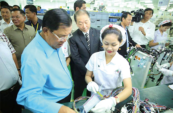 洪森总理19日上午来到了国公省的汽车部件生产商矢崎公司(Yazaki)工厂和丰田汽车(TOYOTA)组装厂参观考察,并亲切慰问工厂的员工。 洪森说:“我非常高兴地看到工厂的发展进步,并高兴地看到当地居民有就业机会和获得良好待遇,这充分显示了柬埔寨的工作条件不断改善。”