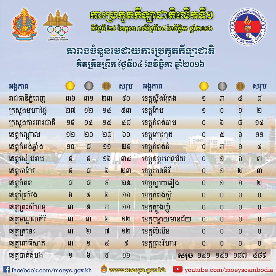 自从2016年11 月4号开始至今举办的国家运动会显出暂时成绩: 金边市代表队:36枚金牌、31枚银牌、23枚铜牌,共90枚获奖牌 内政部代表队:27枚金牌、12枚银牌、14枚铜牌,共53枚获奖牌 国防部代表队:19枚金牌、14枚银牌、15枚铜牌,共48枚获奖牌 干拉省代表队:12枚金牌、20枚银牌、28枚铜牌,共60枚获奖牌 磅通省代表队:10枚金牌、8枚银牌、11枚铜牌,共29枚获奖牌 暹粒省代表队:9枚金牌、9枚银牌、16枚铜牌,共34枚获奖牌 茶胶省代表队:9枚金牌、8枚银牌、6枚铜牌,共23枚获奖牌 贡布省代表队:8枚金牌、8枚银牌、9枚铜牌,共25枚获奖牌 波萝勉省代表队:6枚金牌、4枚银牌、6枚铜牌,共16枚获奖牌 西哈努克省代表队:3枚金牌、5枚银牌、3枚铜牌,共11枚获奖牌 蒙多基里省代表队:3枚金牌、3枚银牌、6枚铜牌,共12枚获奖牌 桔井省代表队:3枚金牌、2枚银牌、7枚铜牌,共12枚获奖牌 菩萨省代表队:3枚金牌、1枚银牌、9枚铜牌,共9枚获奖牌 马德望代表队:1枚金牌、6枚银牌、9枚铜牌,共16枚获奖牌 上丁省代表队:1枚金牌、3枚银牌、4枚铜牌,共8枚获奖牌 白马省代表队:1枚金牌、0枚银牌、1枚铜牌,共2枚获奖牌 磅针省代表队:0枚金牌、6枚银牌、8枚铜牌,共14枚获奖牌 戈公省代表队:0枚金牌、5枚银牌、6枚铜牌,共11枚获奖牌 奥多棉芷省代表队:0枚金牌、1枚银牌、6枚铜牌,共7枚获奖牌 拉达那基里省代表队:0枚金牌、1枚银牌、2枚铜牌,共3枚获奖牌 柴桢省代表队:0枚金牌、1枚银牌、1枚铜牌,共2枚获奖牌 磅士卑省代表队:0枚金牌、0枚银牌、0枚铜牌,共0枚获奖牌 特本克蒙省代表队:0枚金牌、0枚银牌、0枚铜牌,共0枚获奖牌 班迭棉吉省代表队:0枚金牌、0枚银牌、0枚铜牌,共0枚获奖牌 珠山省代表队:0枚金牌、0枚银牌、0枚铜牌,共0枚获奖牌 柏威夏省代表队:0枚金牌、0枚银牌、0枚铜牌,共0枚获奖牌 共获取151枚金牌、151枚银牌、187枚铜牌全共获奖牌为489枚。 更多资讯关注7JPZ.com |