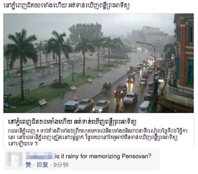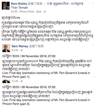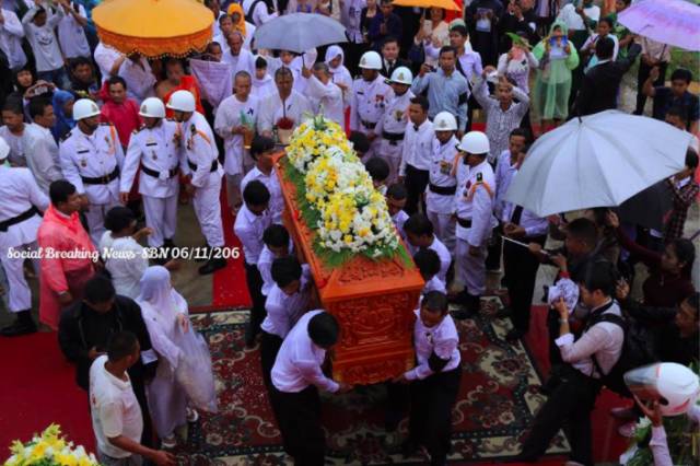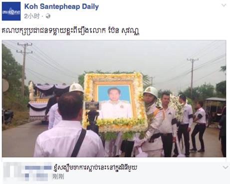 6 日早上7点左右,柬埔寨前总理宾索万的遗体被送往市郊的濡悉善寺(Wat Russey Sanh)进行火化仪式。 多位救国党的官员与民众身着丧服参加了宾索万送葬仪式,送宾索万最后一程。 送行的救国党人及普通民众 葬礼仪式井然有序在的在濡悉善寺进行。 送葬现场井然有序 整个场面沉重而庄严,送葬者都面露悲伤,更有送行者为宾索万的离世哭泣。 送行者对宾索万的离世感到悲伤 救国党领导人沈良西和金索卡的脸书今早也一直密切关注着宾索万火化仪式的状况。 沈良西和金索卡的脸书发布的最近消息 6 日金边的天气也恰逢阴雨天,从早上6点到下午2点左右近8个小时,都没有出现太阳光。 在该新闻下,有网友留言:金边今天阴雨是否为了纪念宾索万的离世呢? 网友在该消息下的留言 网民留言“愿你一路走好” 对于宾索万的离世,也有的民众们在社交网上了表达希望宾索万一路走好。转自吴哥时报(艾琪) |