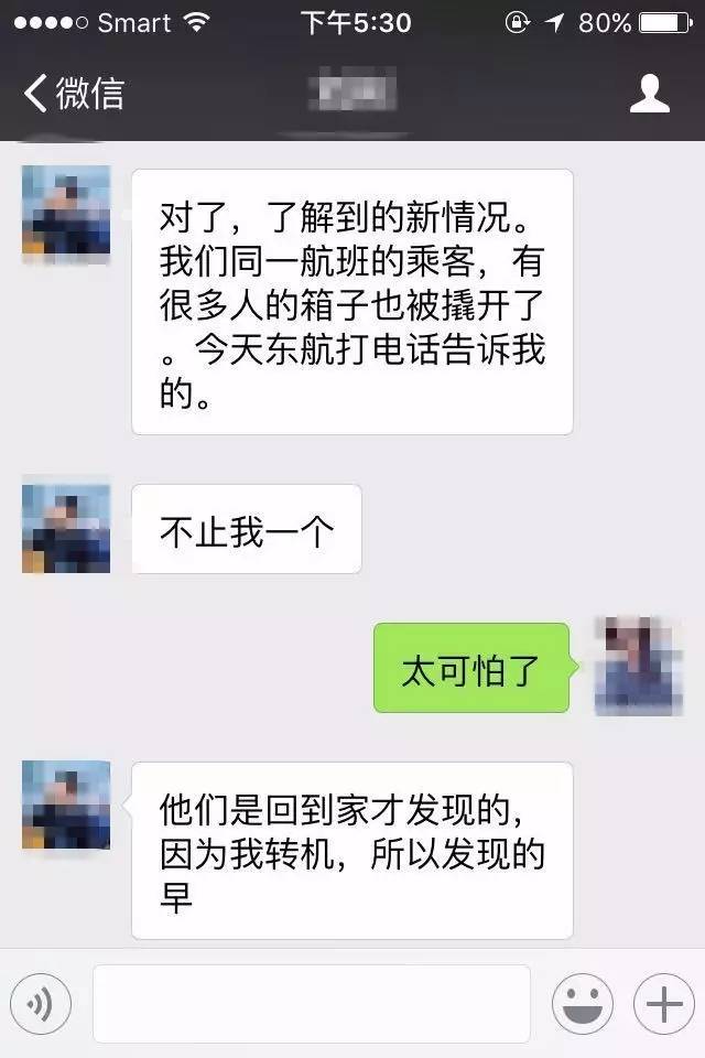 在行李被盗事件爆出后,刘先生又进一步向小编透露,和他同一航班的乘客,有很多人的箱子都被撬开了,不止刘先生一个!而东航的工作人员也称会并案交由总公司一同处理。