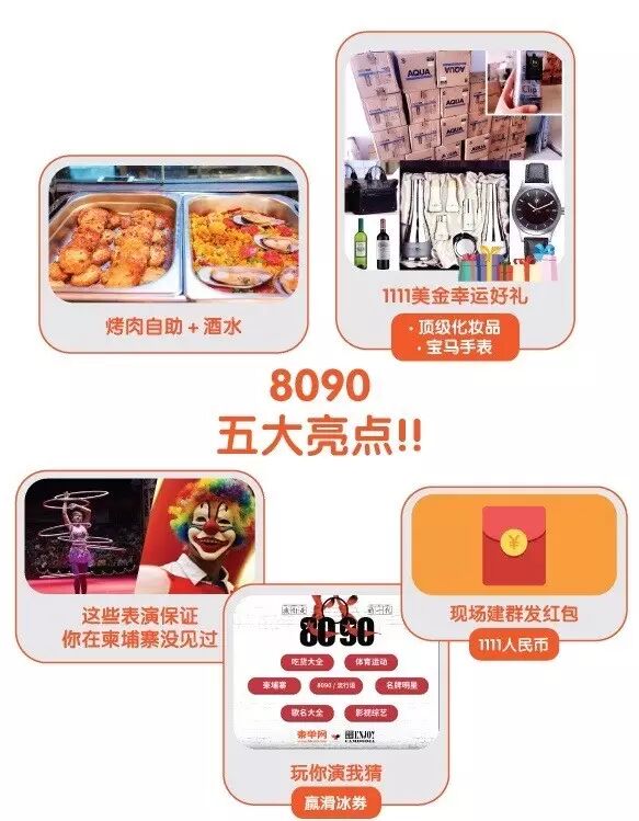 五!亿! --等等 --在柬埔寨,红包跟你没关系? --谁说的! 这个双11 奋 斗 在 柬 埔 寨 之 80 ,90 后 华 人 交 流 会 给你发红包! ▼ 这不只是一场、 专属80,90后的、 高端休闲酒会、 更有 五大亮点! 【1111美金的奖品】 伴手礼:Clip杯---进门就有! 抽奖礼品:宝马手表+CentralMall旅行箱+LG化妆品+CDF手提包+IDD红酒 【1111元的微信红包】 1111元,现场建群,现场发 【高端自助烤肉+酒水】 Samba Elite顶级自助+IDD红酒+金边啤酒软饮 如果你也是-- 80后的精英 90后的新秀; 80后的大叔 90后的鲜肉; 80后的才子 90后的佳人; 80后的车房奴 90后的月光族; 80后的大老板 90后的CEO; 我们在这里等着你! 【地点】 Samba Elite 餐厅(堆谷区315路 87号)