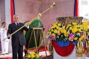 11月9日,柬埔寨隆重庆祝独立63周年,西哈莫尼国王当天亲临独立纪念碑点燃圣火,启动为期三天的庆祝活动。(柬埔寨星洲日报)