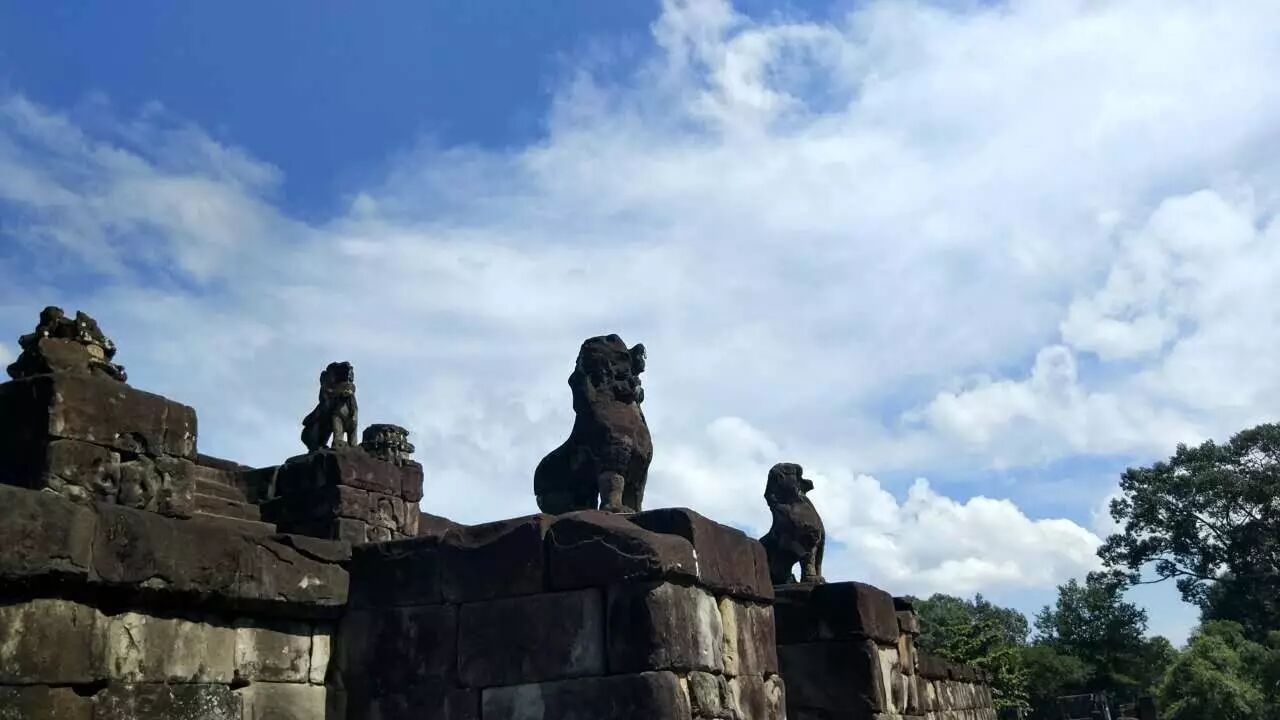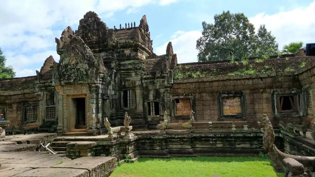 在巴公寺(Bakong Temple)环形渠对岸,中央塔尖隐隐绰绰。 如果足够幸运,会有猴子来和你玩耍。友人告知,曾有猴子划水后向他靠近,哼哼唧唧要讨吃的,还捏他的鼻子,跳上他的肩膀嬉戏,可惜我这次没有遇见。 这猴子含情脉脉的眼神哟 绕过环形渠,来到巴公寺。门口就有娜迦(Naga)形状的栏杆,进去时游人如织,拍正面景观等了好久还是有游客背景。但找些僻静的地方还是有可能拍到想要的无人之境哦。 这是最早的金字塔型的寺庙,有五层平台,每一层的含义都不一样。底层是娜迦的世界,第二层是迦鲁达的,第三层是夜叉,第四层是罗刹,顶层是属于神的世界。狮子和大象的雕像则分别镇守八个方位。 我是正午爬上去的,楼梯很陡,气温也相当高,年纪大的游客要注意安全。一个法国老爷爷就在第三层平台上跌倒了,太阳又很毒辣,我就赶紧和工作人员一起扶着他下去了。 僧人在寺庙诵经,窗口有两只可爱的猫咪,一只凶凶哒,一只萌萌哒。
