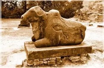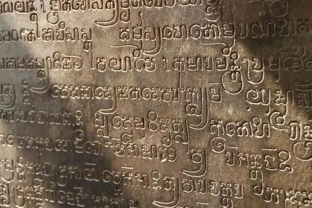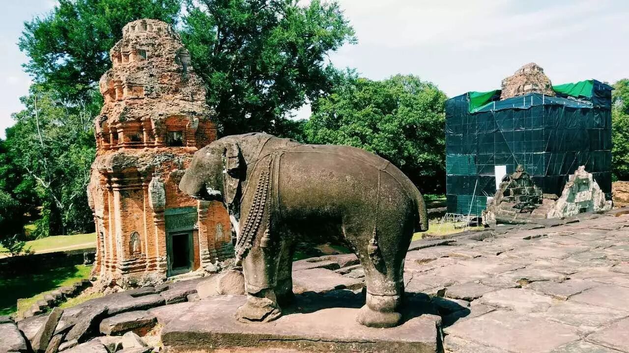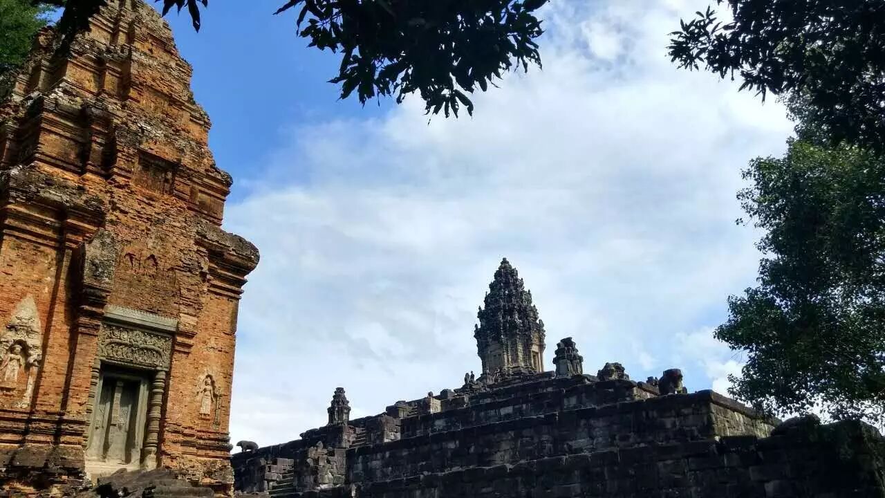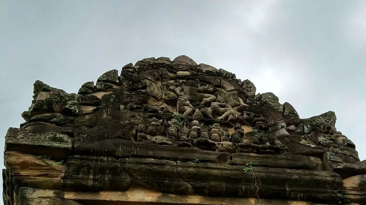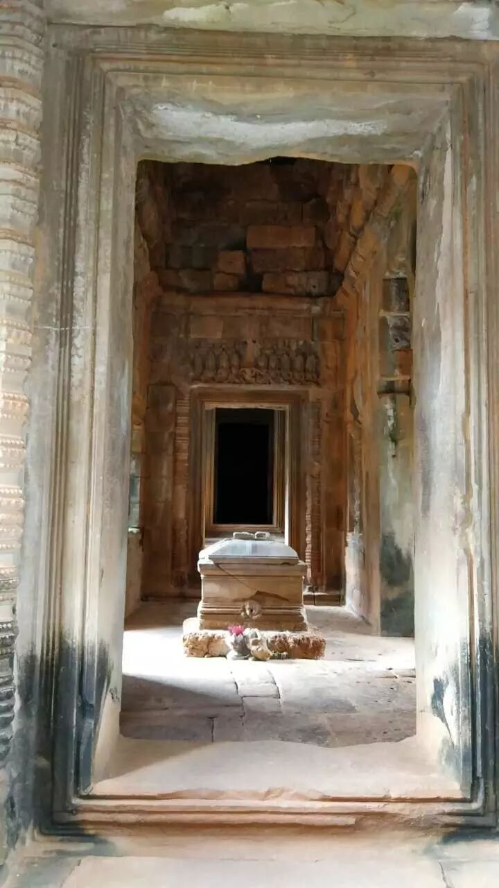 向南途中会经过罗莱寺(Lolei),这座寺庙是由耶苏跋摩一世在893年建造,信奉的宗教是印度教(湿婆派)。它独特的一点在于,当时建造在水池中央的小岛上,不过现在水池已经干涸。殿堂在修复中。但依稀可以看到大力金刚和仙女。 金刚和仙女的雕像 出了罗莱寺,穿过6号公路就到了神牛寺(Preah Ko), 这是时间最为久远的寺庙,于879年建造,殿堂前有三座神牛难底(湿婆神的坐骑)的石像,殿堂的门框上有古老的古高棉铭文,很多词汇如今仍被大量使用。 神牛难底和门框上的铭文,图片来自网络。 精美又斑驳的石雕静静地诉说千年前的故事。