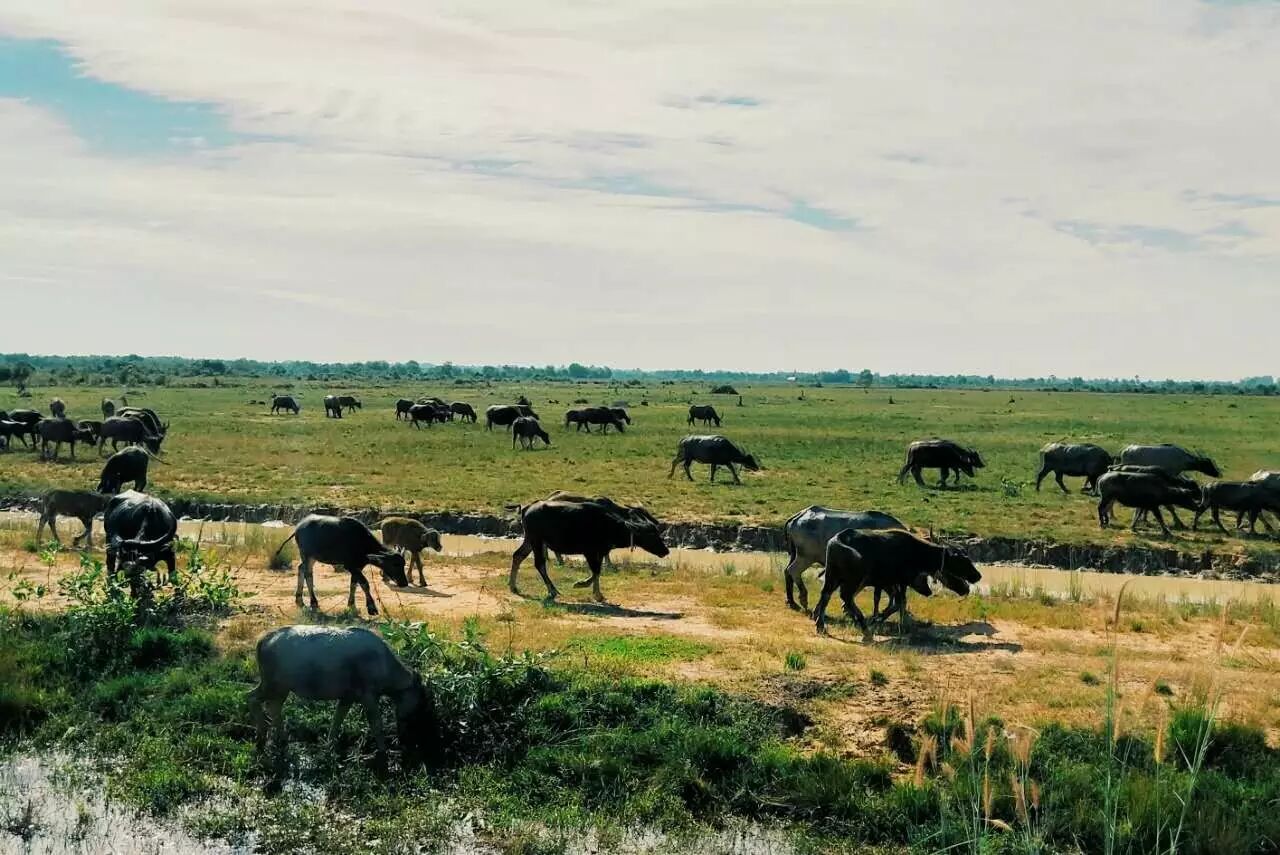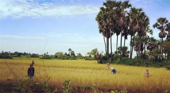 一路上的风景极美,湛蓝湛蓝的天空,一大群水牛在悠闲地吃草,头牛脖子上的铃铛叮铃作响。 金黄的稻谷,三三两两的农民和背后的蓝天绿树相印成趣。在我停下来拍照的时候,有的就停下手头的工作,我们互相问好。左边的柬埔寨大哥笑得可甜了,想必今年又是丰收。 骑行在小道上,时不时还有孩子的可爱笑脸,只是单纯的问好哦,心都被软化了。