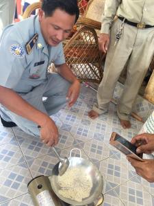 (菩萨讯)僧侣在脸书散播“塑胶假米”消息,引起当局关注及派员到寺庙查证,发现纯属造谣。 据了解,苏利亚寺庙多名僧侣怀疑食用的大米为“塑胶假米”,并在脸书上散播消息,令我国再次掀起假米疑云。 为了查证假米的真实性,副省长郭达妮于24日,率领货检局及宗教局官员前往苏利亚寺庙突袭检查。 货检局官员当场把烧热的铁板置入米桶中,再把大米放入铁锅中加热,结果发现大米没有粘附在铁板或铁锅中,也没有发出烧焦味道,证明寺庙里的大米是100%“真米”。 过后,散播谣言的僧侣承认犯错,并向当局及民众道歉,而货检局也要求其写悔过书,承诺不再破坏柬埔寨大米的信誉。(柬埔寨星洲日报) 执法人员到寺庙检查僧侣食用的大米。(图:柬埔寨星洲日报) 大米在铁锅中加热后,并没有“粘锅”及发出焦味,证明是“真米”。(图:柬埔寨星洲日报) |